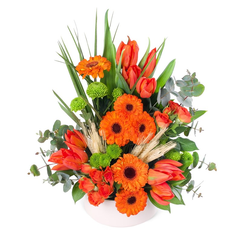 Canlı ve enerjik turuncu tonlarıyla hazırlanan bu özel çiçek aranjmanı; turuncu gerbera, turuncu lale ve yeşil krizantemlerin uyumlu birleşimiyle göz alıcı bir tasarım sunar. Doğum günü, yeni iş tebriği, geçmiş olsun ziyareti ya da sevdiklerinize içten bir sürpriz yapmak için tercih edebileceğiniz bu turuncu çiçek aranjmanı, bulunduğu ortama pozitif enerji ve sıcak bir atmosfer katar. Taze ve özenle hazırlanan çiçekleriyle uzun süre canlılığını koruyan bu tasarım, aynı gün teslimat seçeneğiyle sevdiklerinizi mutlu etmenin en zarif yollarından biridir.