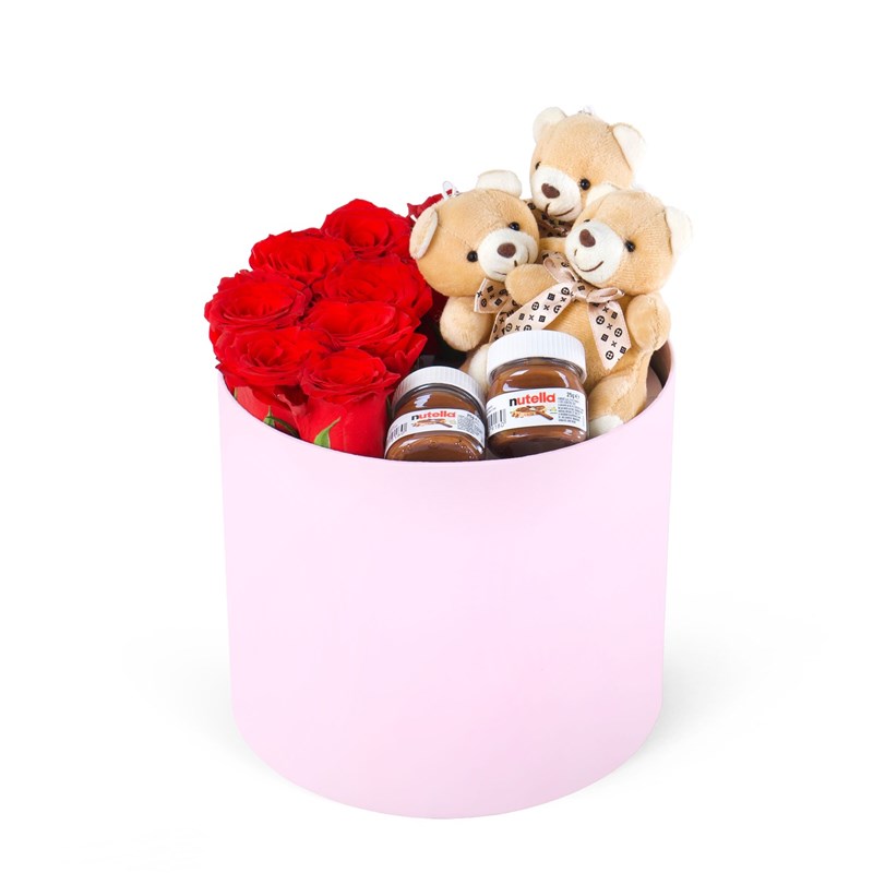 Şık kutu içerisinde hazırlanan bu özel aranjmanda 9 adet kırmızı gül, 3 sevimli ayıcık ve 2 adet mini Nutella yer almaktadır. 21x23 cm ebatlarındaki kutusu ile hem romantik hem de eğlenceli bir hediye seçeneği sunar. Kırmızı güllerin zarif anlamı, tatlı sürprizlerle birleşerek sevdiklerinize unutulmaz bir mutluluk yaşatır.