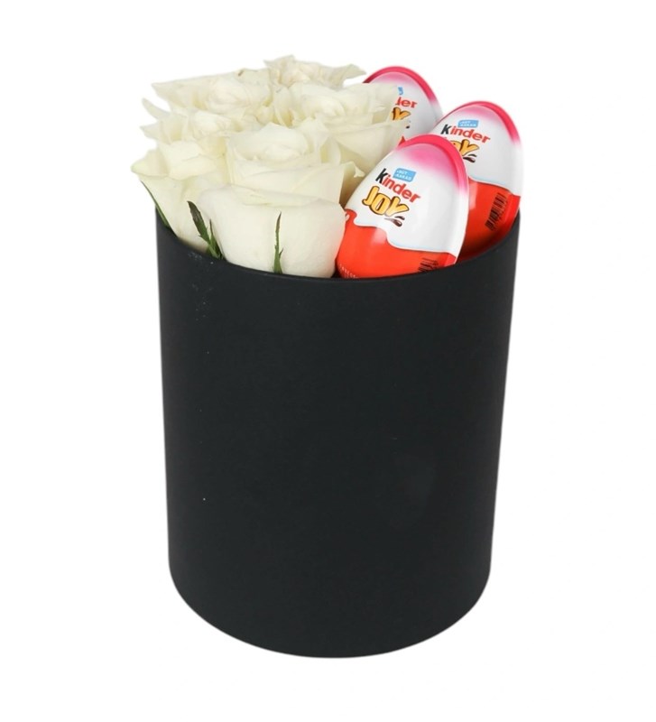 Kutuda 5 adet beyaz gül 3 adet kinder joy bulunmaktadır. Kutu ebatları çap-yükseklik: 15x22cm