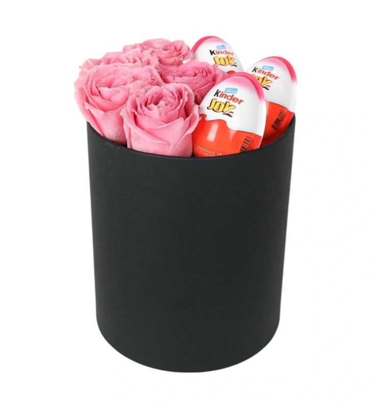 Kutuda 5 adet Pembe gül 3 adet kinder joy bulunmaktadır. Kutu ebatları çap-yükseklik: 15x22cm