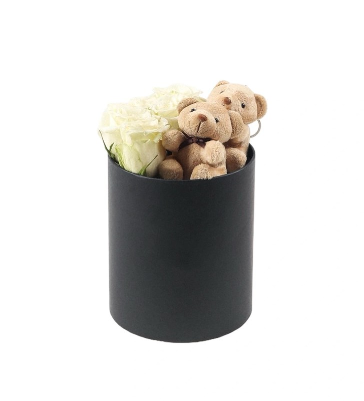 Yuvarlak Siyah Kutuda Ayıcıklı Beyaz Gül