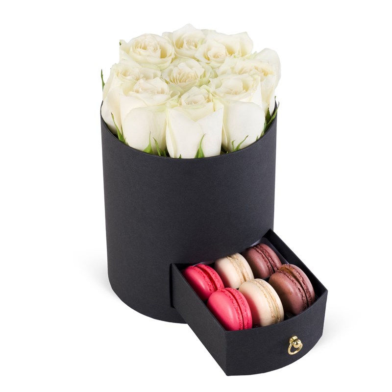 Yuvarlak Siyah Kutuda Macaronlu Beyaz Gül