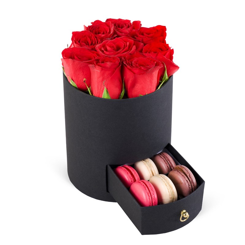 9-10 adet ithal kırmızı gül. 6 adet macaron. 15x26 cm ölçülerindedir. Kapağı mevcuttur.